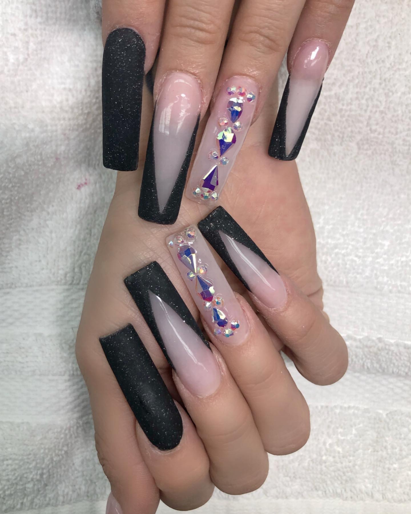 These matte black tips are fire! The rhinestones are secure and look so expensive. Highly recommend this salon for long sets.